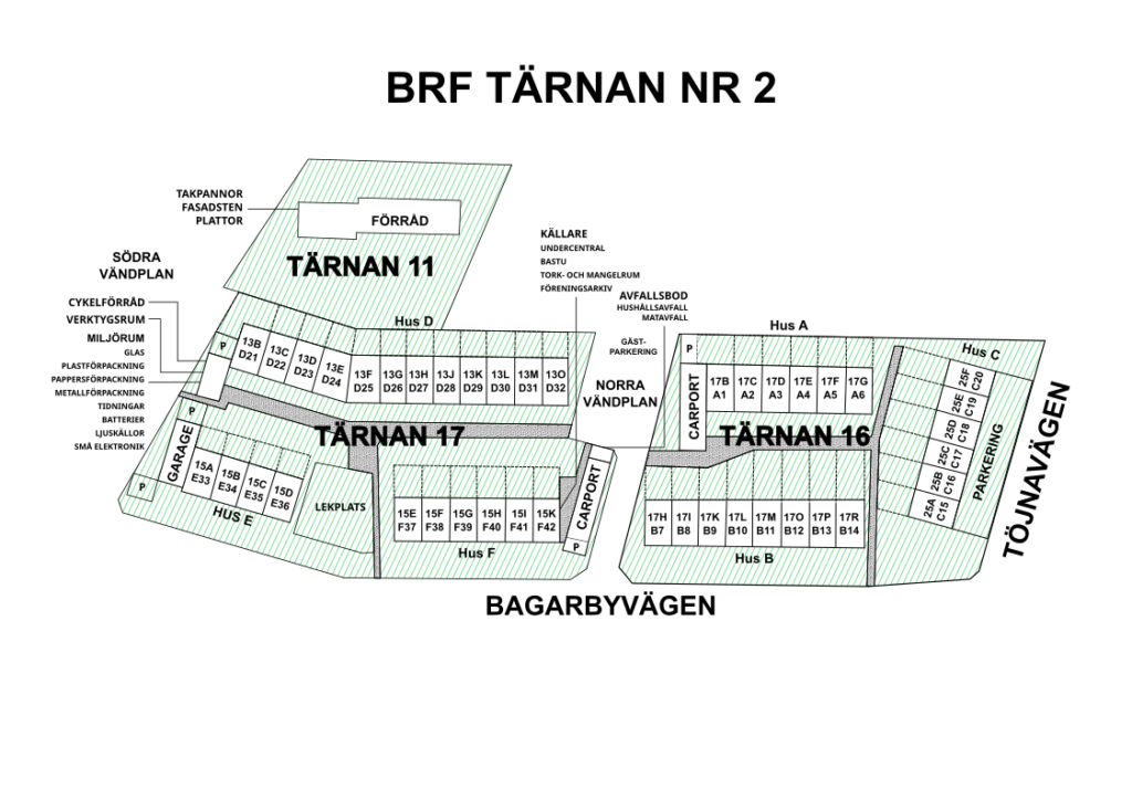 Hobbyrum, bastu och mangel/torkrum finns i källaren på hus F, ingång på norra gaveln.